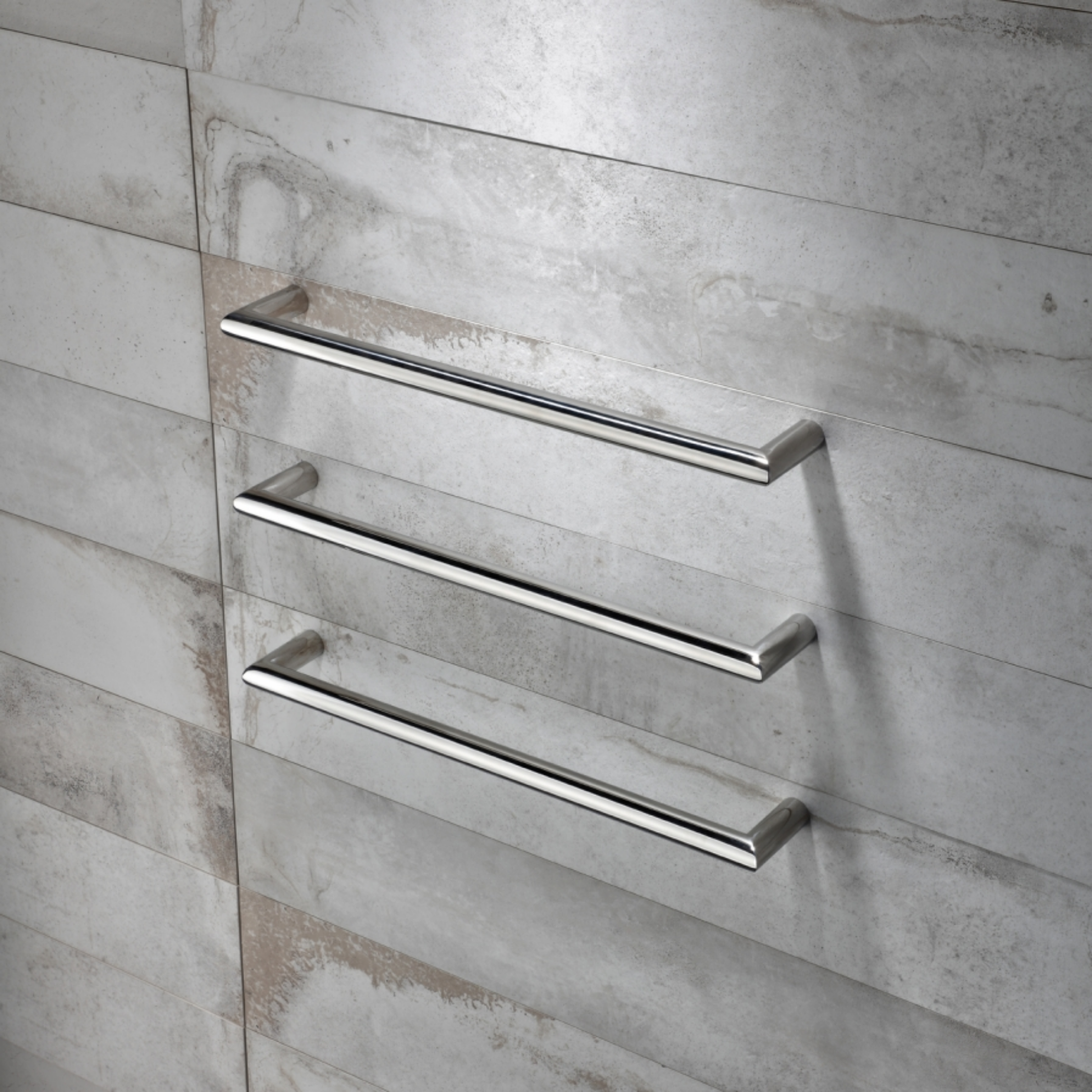 Being free of a frame, individual Strata towel rails draw attention to the actual rails which will look as if they are floating on the wall and give a more horizontal and linear relationship with the rest of the bathroom. They therefore look more integrated into the overall bathroom design.